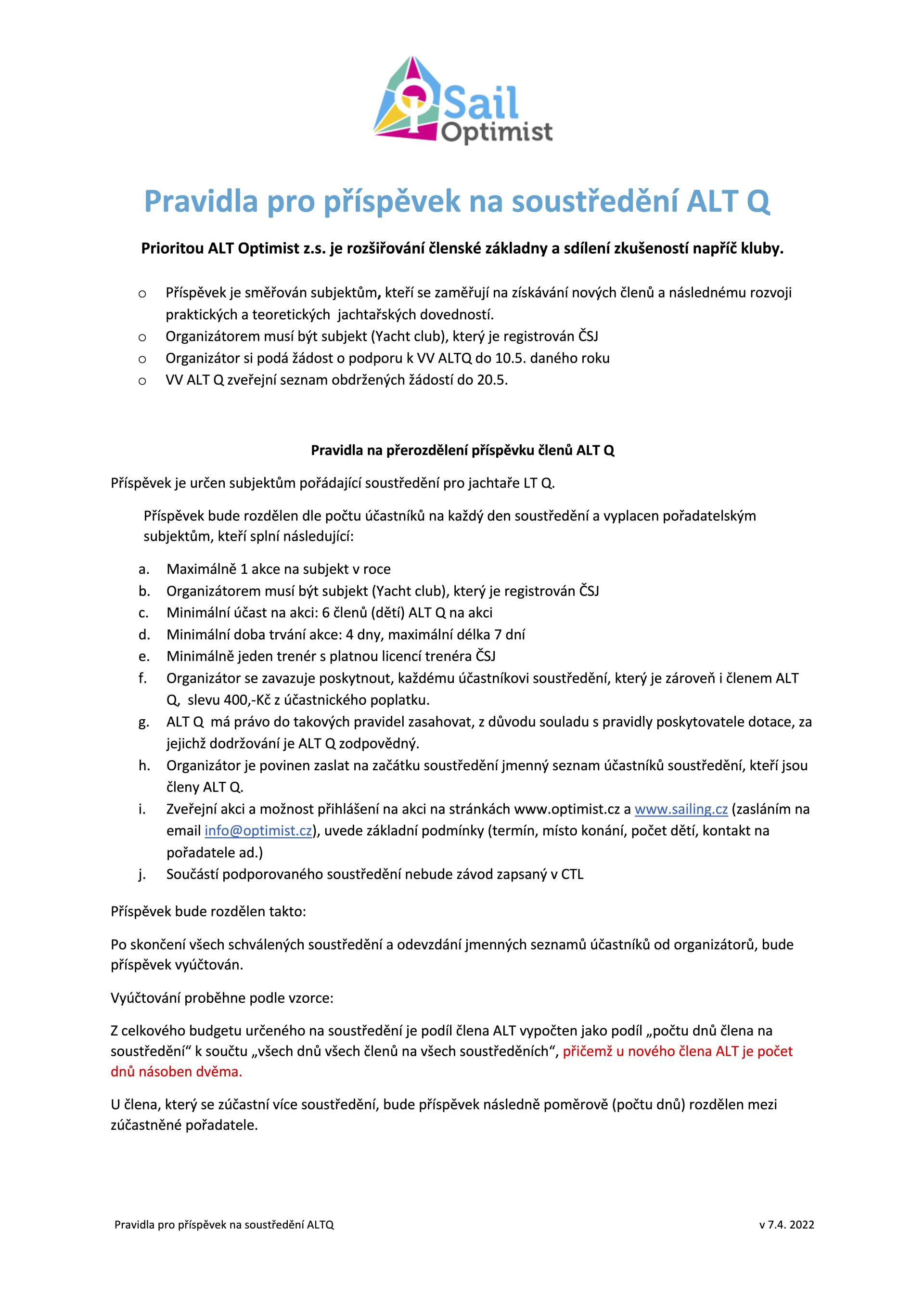 Pravidla pro příspěvek na soustředění ALT Q