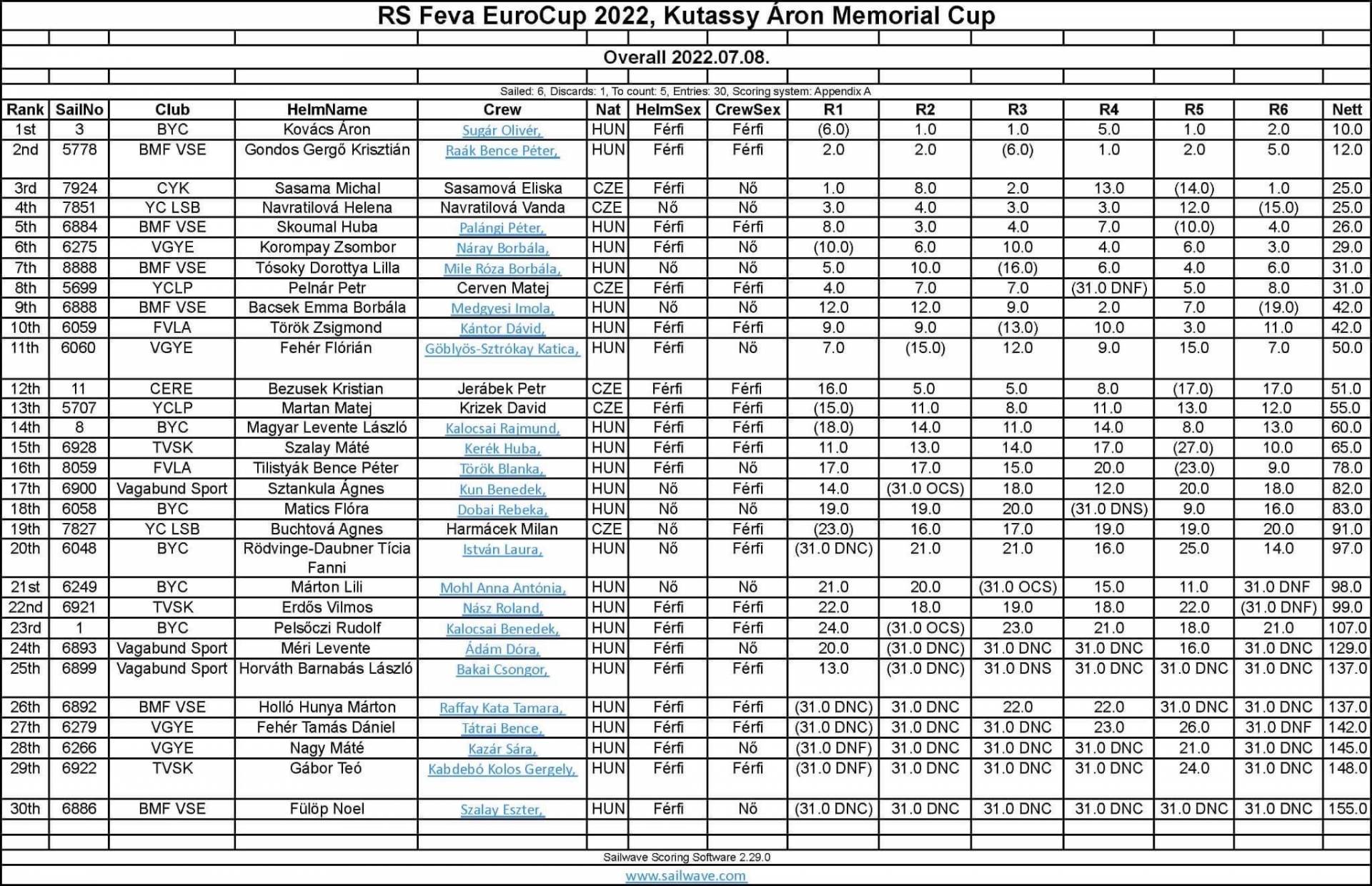 A v náročných jachtařských podmínkách se odjelo 6 rozjížděk a týmu se dařilo skvěle! Na celkovém třetím místě skočila pražská posádka z Českého Yacht Klubu Michal a Eliška Sazamovi. Sestry Helena a Vanda Navrátilovy přivezly do Brna 4. místo v absolutním pořadí a vyhráli kategorii dívek. Do první desítky se vešli ještě plzeňští Petr Pelnář a Matěj Červeň.