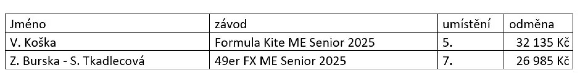 Návrh usnesení: Výkonný výbor ČSJ schvaluje v souladu se směrnicí C21 – ohodnocení za výsledky na MS a ME pro členy RD a juniory na základě návrhu SÚ ČSJ následující vyplacení odměny za výsledky: Formula Kite ME Senior 2025 – Vojtěch Koška 32 135 Kč. 49er FX ME Senior 2025 - Zosia Burska – Sára Tkadlecová 26 985 Kč.
