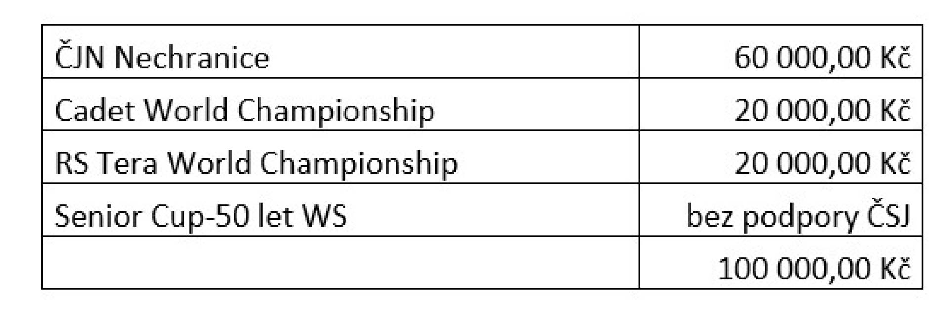 Návrh usnesení: Výkonný výbor ČSJ schvaluje po projednání a diskuzi předložený návrh podpory významných sportovních akcí v roce 2025: ČJN Nechranice – 60 000 Kč, Cadet World Championship 20 000 Kč, RS Tera World Championship 20 000 Kč, Senior Cup – 50 let WS – bez podpory. Prostředky budou vyplaceny z rozpočtové kapitoly 3604.