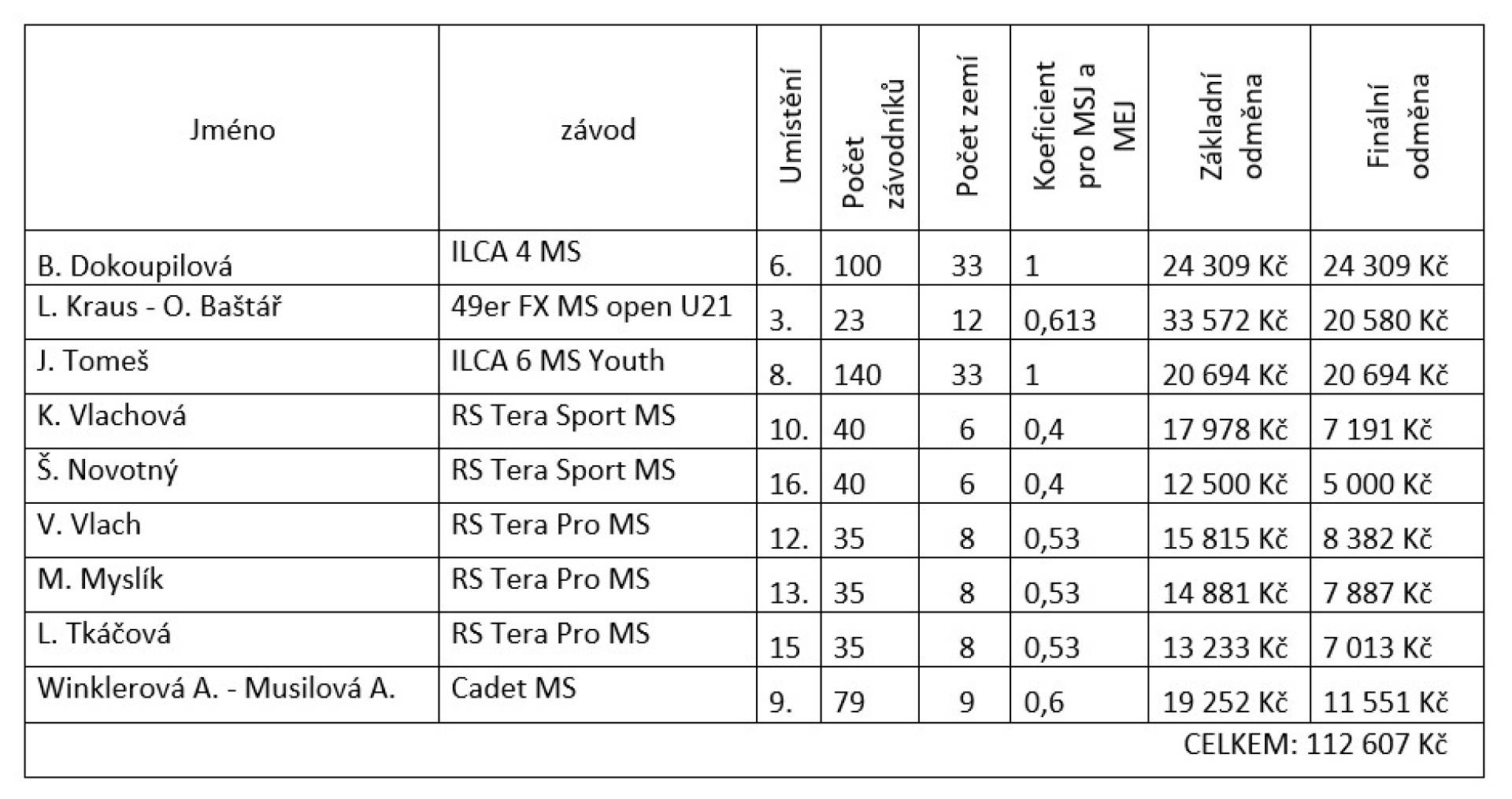 MS a ME pro členy RD a juniory na základě návrhu SÚ ČSJ následující vyplacení odměny za výsledky: ILCA 4 MS 2025 – Beata Dokoupilová 24 308 Kč. 49er FX MS open U21 – Lukáš Kraus – Ondřej Baštář 20 580 Kč. Jiří Tomeš 20 694 Kč, Kamila Vlachová 7 191 Kč, Štěpán Novotný 5 000 Kč, Viktor Vlach 8 382 Kč, Matyáš Myslík 7 887 Kč, Lucie Tkáčová 7 013 Kč, Anna Winklerová – Anna Musilová 11 551 Kč.