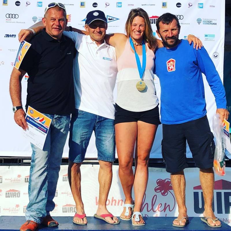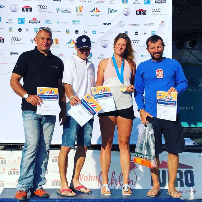 „Z Warnemünde jsme si navíc přivezli i zlato!!! V závodě smíšených týmů jsme spojili síly se Slovenskem. Závod se odjel v jednom dni za slabých větrných podmínek kolem 4 m/s. Ve třech rozjížďkách jsme si vedli jako tým výborně. Závod měl super atmosféru, vzájemně jsme se podporovali a taktizovali. Moc děkuji Patrikovi, Milanovi a mému tátovi, že jsme do toho šli, bojovali a vyhráli. Bylo to super,“ uvedla Jana Slívová.